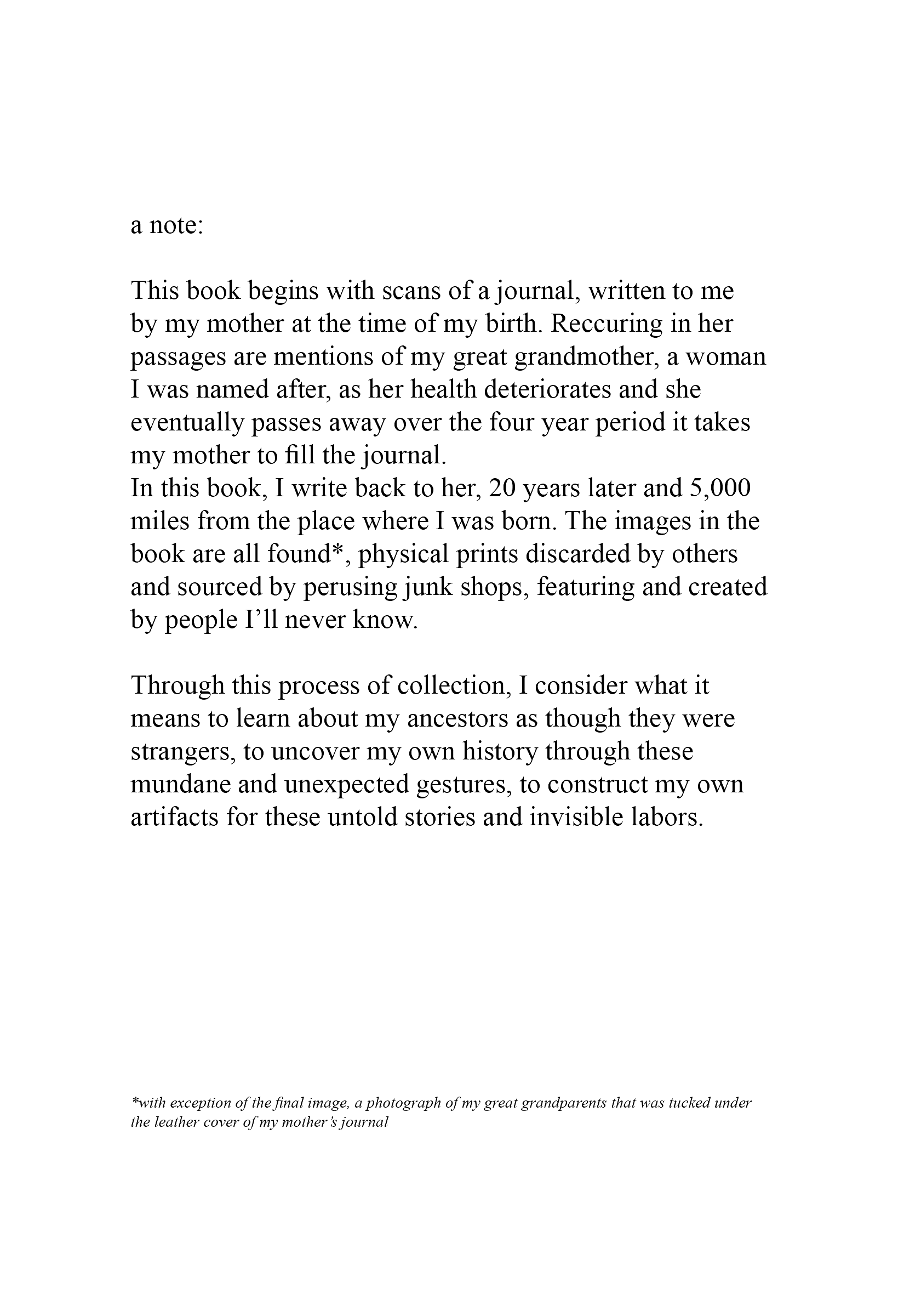 from the author: “This book is a dialogue between my mother and I, 20 years and 5,000 miles between us. At the time of writing it, I was extensively collecting photographs, yet few of them made it into the original printed version of the book. I use this process of acquiring found images as a tool for illustrating my own family’s history, considering what separates our ancestors from strangers.”
